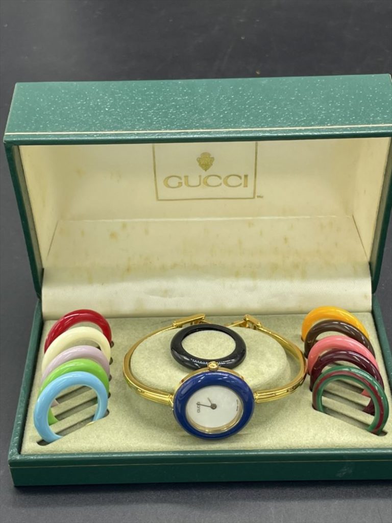 商品情報 ブランド名 グッチ 品目 腕時計 チェンジベゼル 状態 C 買取担当からのコメント グッチのレディース腕時計 チェンジカラーベゼルをお買取りいたしました。 ケースの周りのベゼル部分を取り換え可能な商品です。 不動状態ですが箱もある状... -
