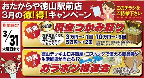 今回もとてもお得なキャンペーン・イベントをご用意いたしました。 この機会にぜひ、おたからや徳山駅前店へお越しくださいませ!